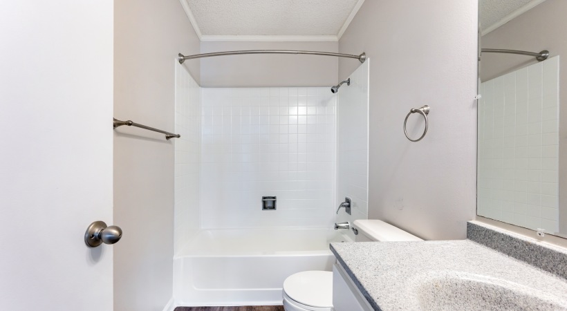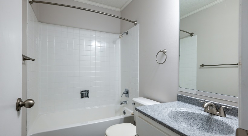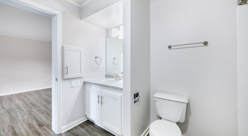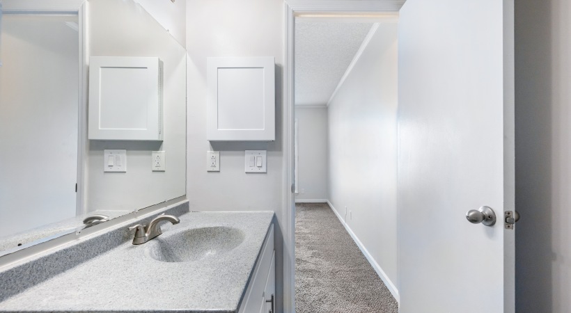 • Bathroom with White Cabinets and Granite-Style Countertops