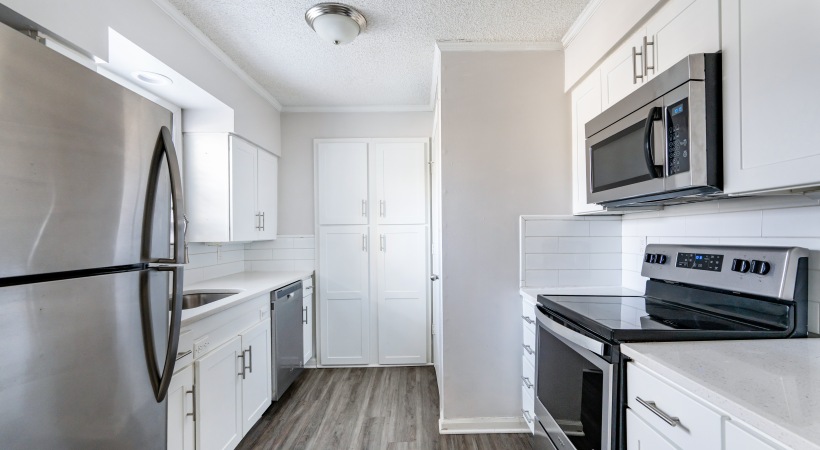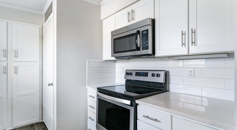 • Bright Kitchen with Quartz Countertops, White Cabinets, Stainless Steel Appliances, and Subway Tile Backsplash