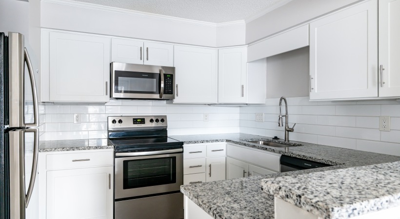 • Bright Kitchen with Granite Countertops, White Cabinets, Stainless Steel Appliances, and Subway Tile Backsplash